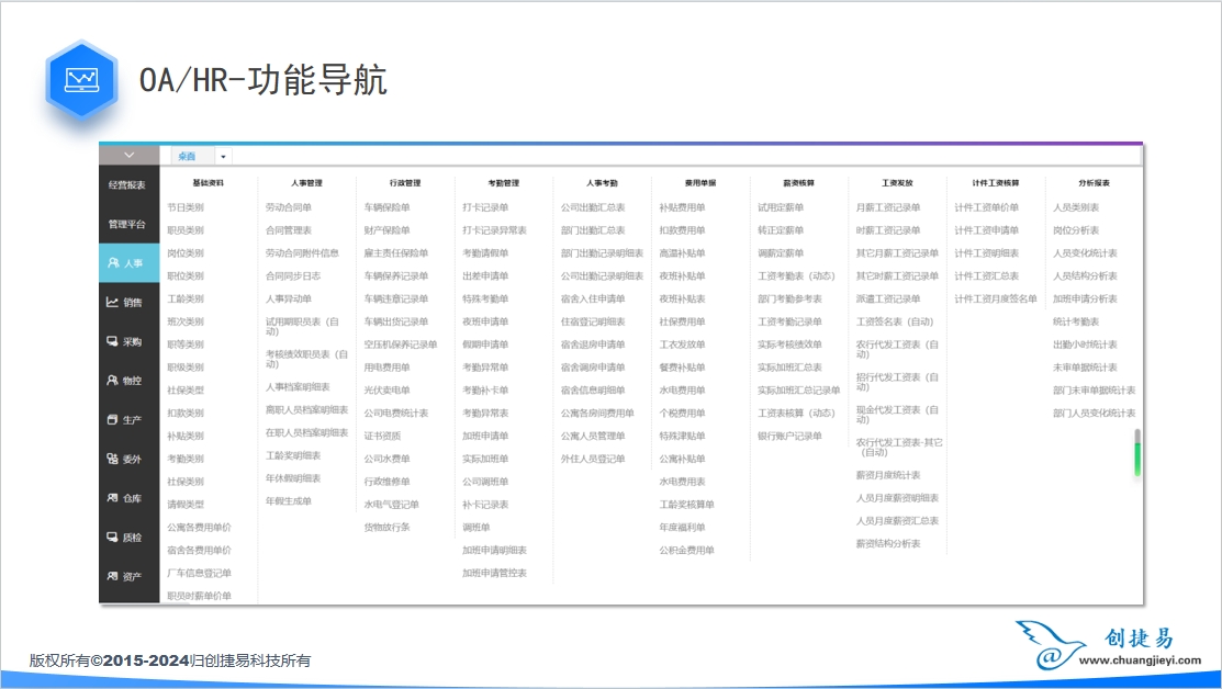 包括人员档案,人事合同,人事变动,考勤,薪资,绩效等的管理。