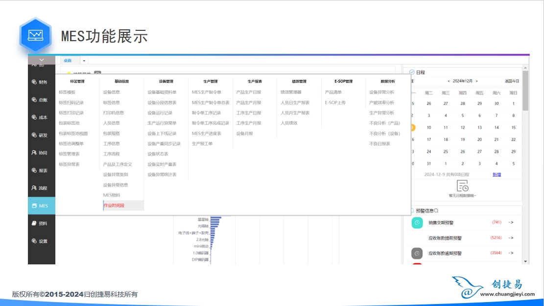 MES,即制造执行系统。系统从底层数据采集开始,到过程监测和在线管理,一直到成本相关数据管理,构成了完整的生产信息化体系。系统各功能模块提供了由底层接近于自动化系统的监控过程逐渐过渡到成本管理的经营层,可以满足企业在信息化生产管理领域不同规划阶段的要求,在继承的基础上实现信息化过程的平稳过渡、逐步提高。