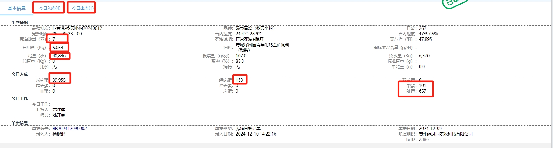 6、养殖的每日登记,包括环境参数,饲料药品疫苗死淘出库,以及各种类型的产物的入库