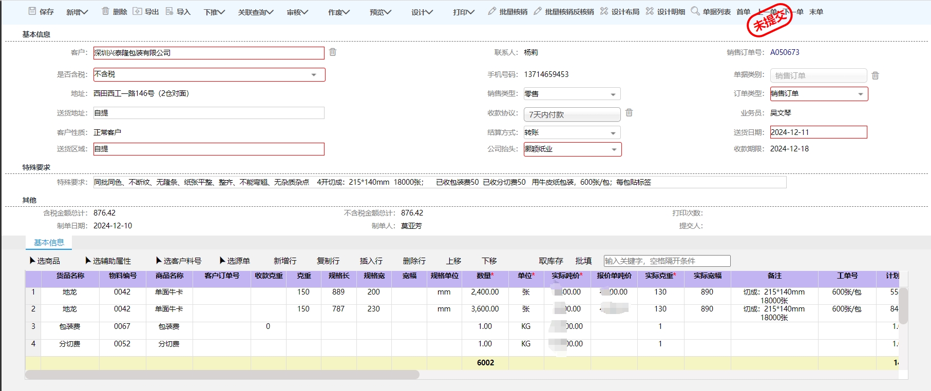 3、优化销售订单录入环节,支持多单位转换(千克/吨,张/令,mm/英寸),支持指定实际货品和克重,自动计算计划用量,实时显示可用量