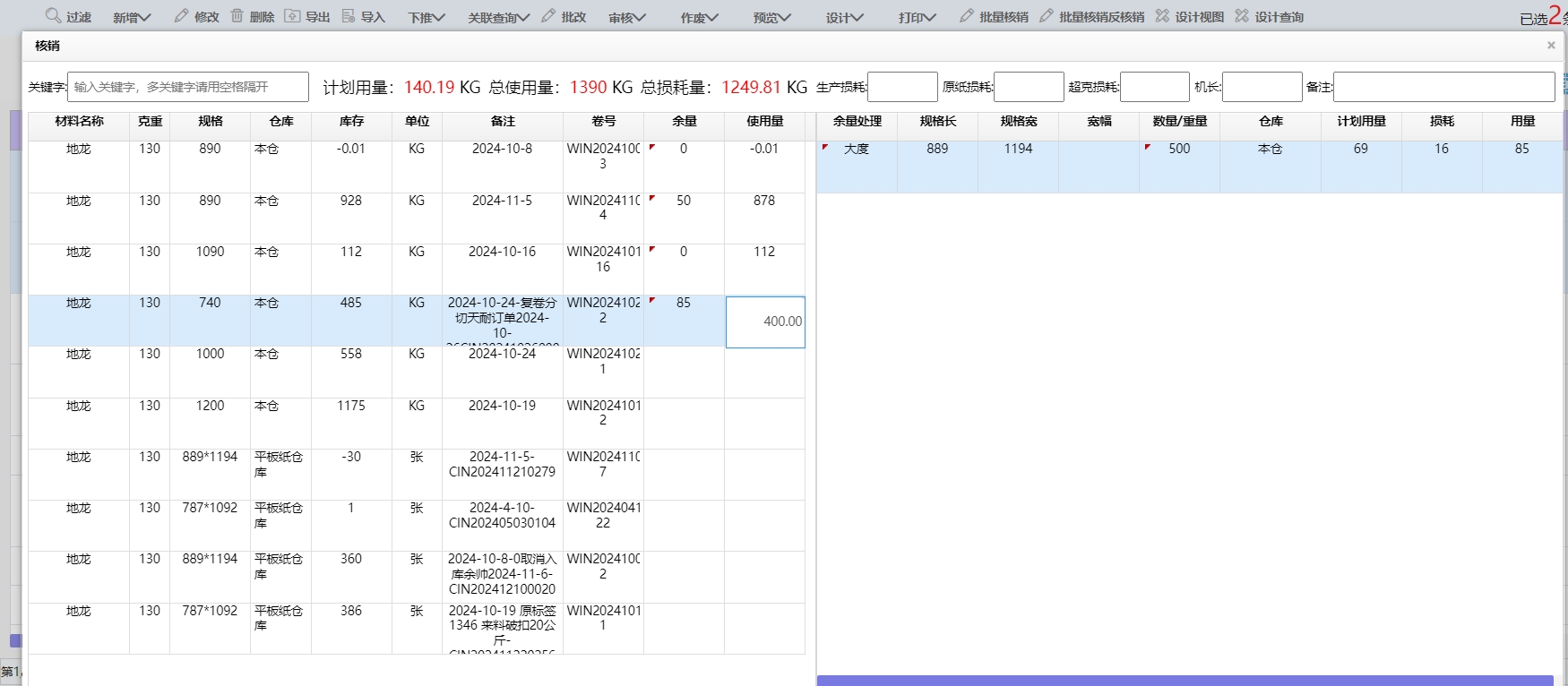 5、定制仓库订单核销功能,实现按单核销到该单用了哪卷纸,以及多单使用多卷纸合并核销,自动按计划用量分摊实际用量,为后面一键核算成本提供依据