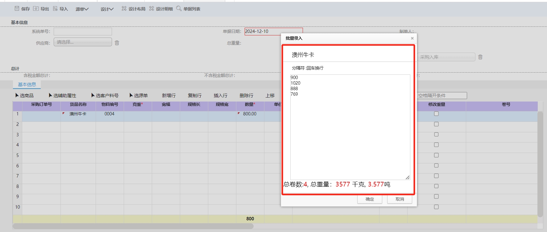 2、优化采购入库录入环节,按卷入库,支持批量录入重量,自动复制其余信息,达到快速入库的目的