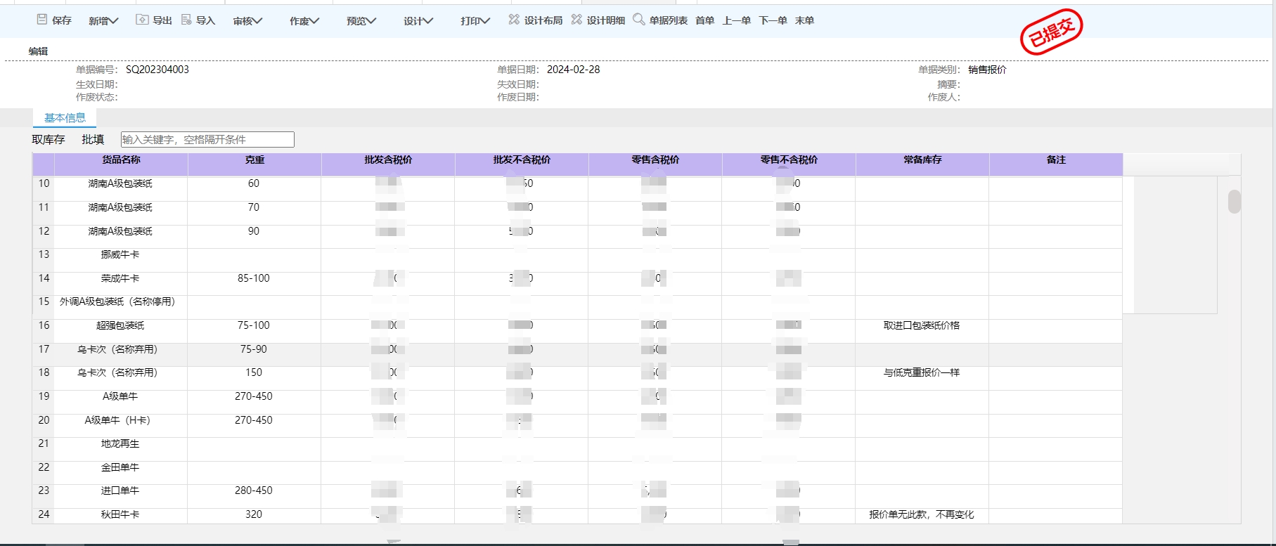 3、销售报价按纸的种类,克重范围进行零售,批发,含税,不含税报价