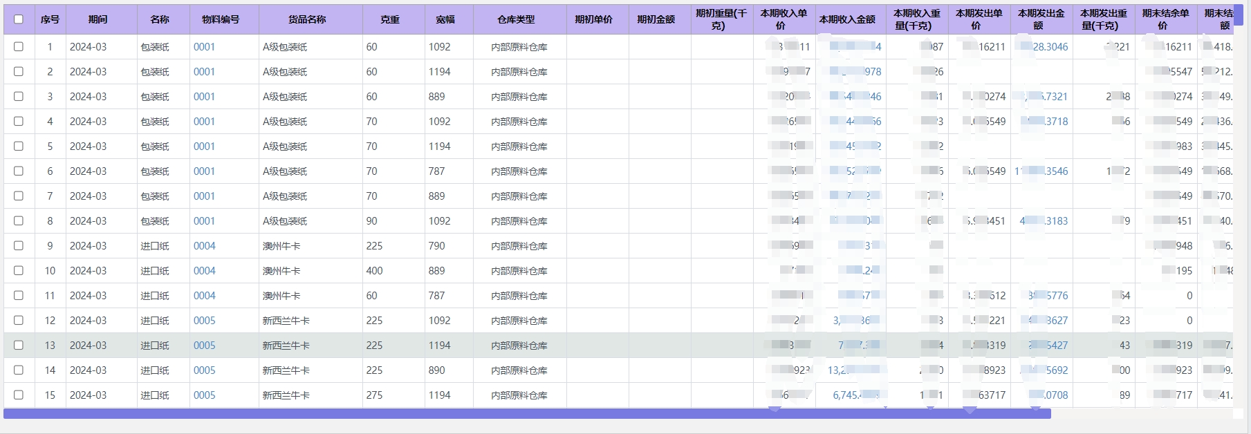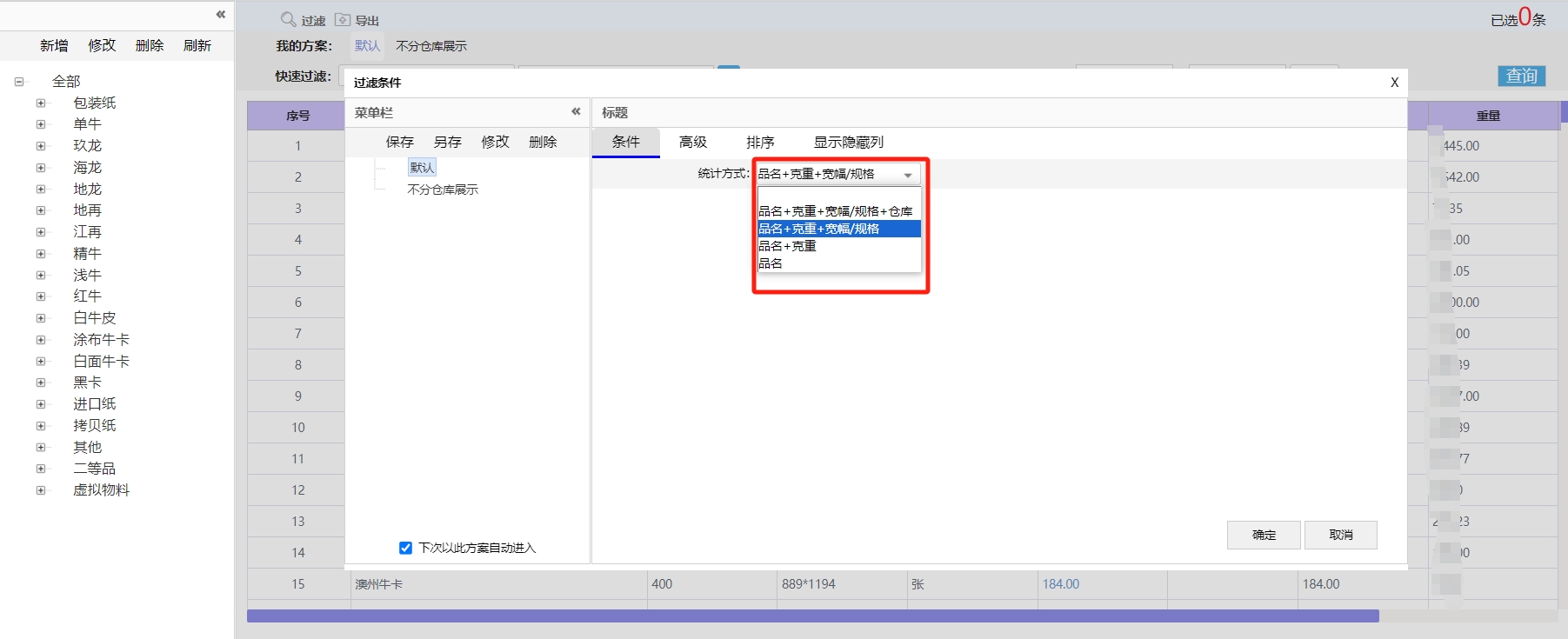 7、按品名+克重+宽幅/规格+仓库,多种组合统计库存余额,方便采购决策