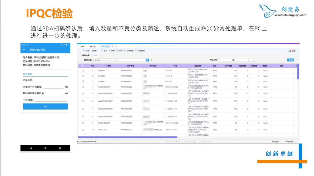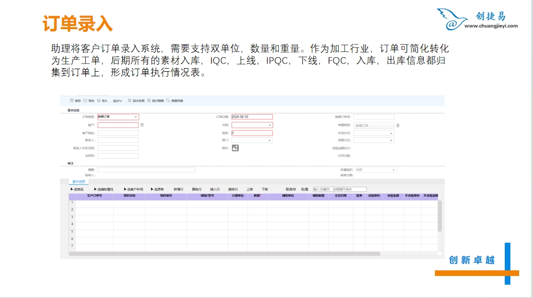 1、按订单全流程管理,从IQC素材入库,领料,上线,工序流转,IPQC质检,下线,称重,包装,入库,发货