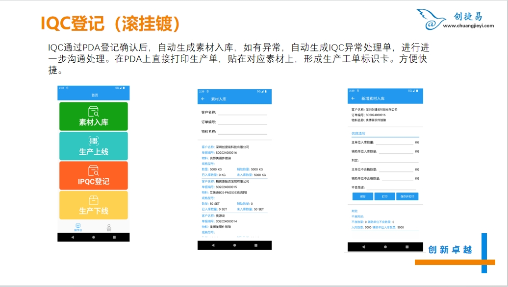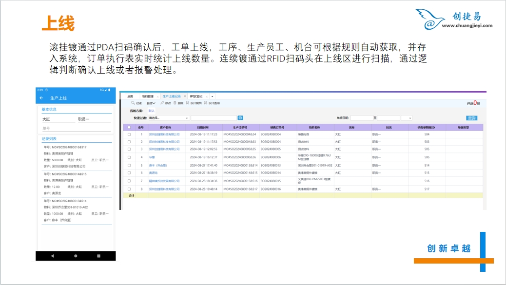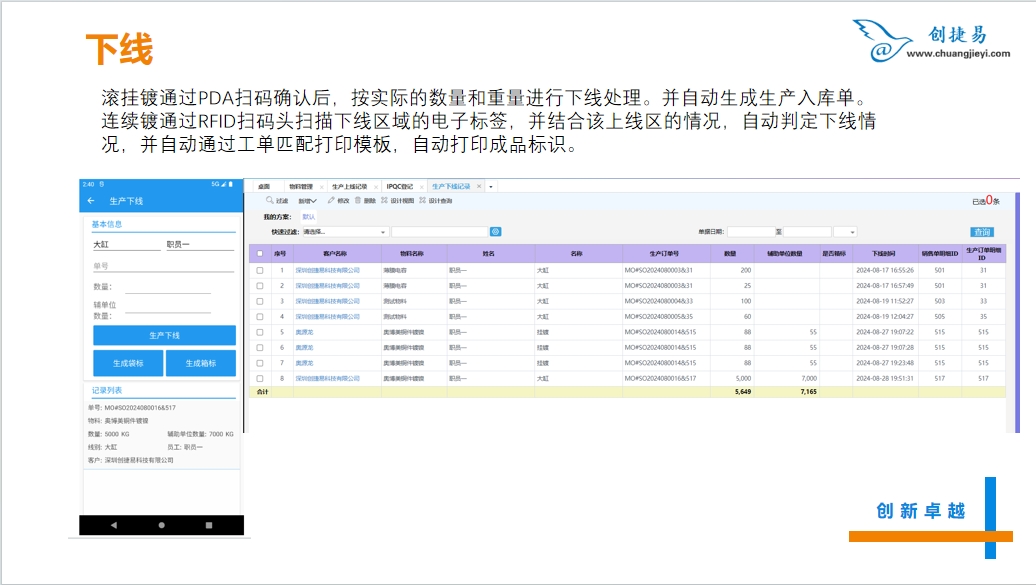 2、连续镀车间,采用了创新的RFID电子标签自动化管理方式,IQC素材入库时绑定订单素材标签,后续全流程通过自动化采集设备实现上线,下线打成品标签,称重,入库