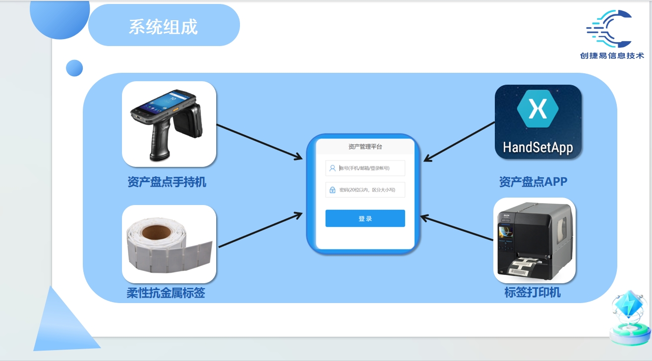 1、在资产表面统一张贴上带有感应芯片的RFID电子标签,将盘点任务下发到RFID盘点设备,远距离无接触一对多感应式高效盘点。